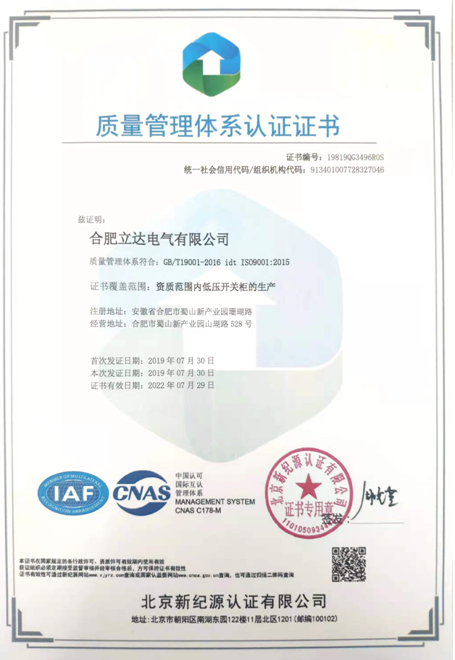 經過國家權威機構北京新紀源認證有限公司專家組的全面、嚴格、細致的指導和審核,確認合肥立達電氣有限公司環境管理體系符合GB/T 24001-2016 idt ISO14001:2015標準,質量管理體系符合GB/T19001-2016 idt ISO 9001:2015標準,并于2019年7月30日向我公司正式頒發了ISO9001質量管理體系認證與ISO14001環境管理體系認證兩大證書。